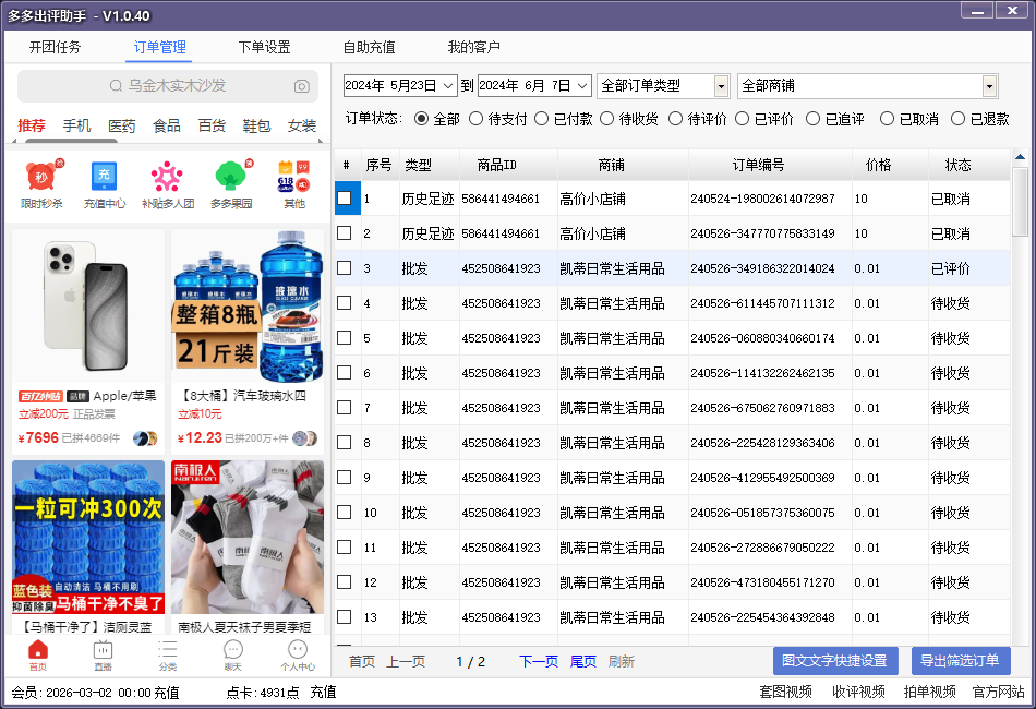 多多权重软件可多任务下单,加倍提高效率;支持批量自动支付订单,免去繁琐操作使用更方便。